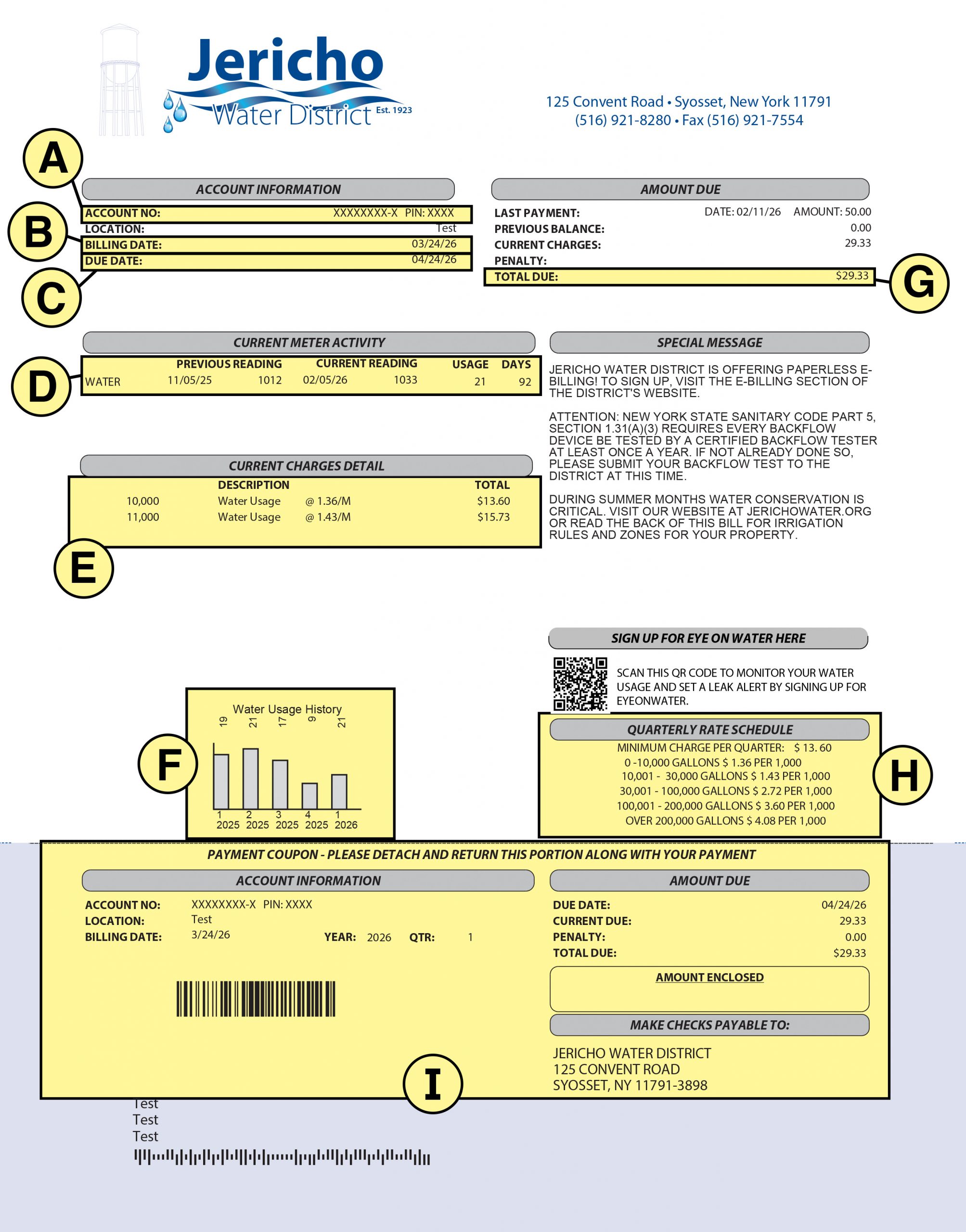 To help you understand your water bill, please refer to the graphic below with the corresponding lettered descriptions. You may call the District Office Monday through Friday between 8:30am and 4:00pm at (516) 921-8280 for any further questions about your bill. We are happy to help you!
